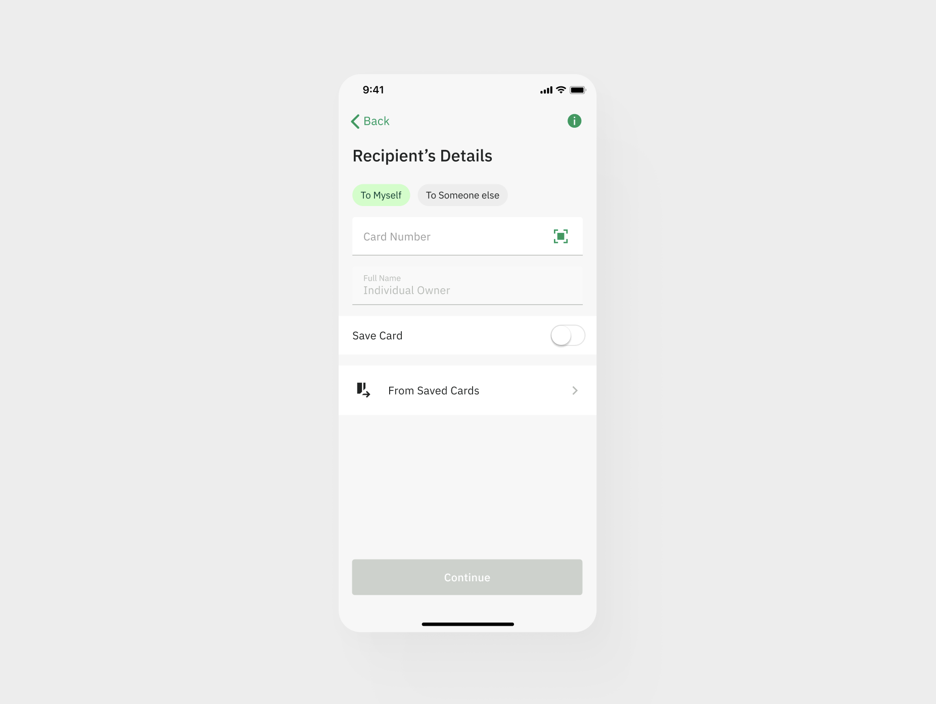 For future transactions, simply select the From saved card tab and choose the card you want to transfer to — without the need to re-enter the card number or the recipient’s full name.